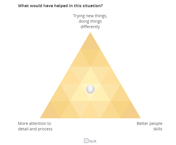 In the leadership sensor, one of the triangle questions asked was, “What would have helped in this situation?” The three points on the triangle were: “More attention to detail and process;” “Trying new things, doing things differently;” and “Better people skills.” A respondent, thinking about the experience they shared, would decide how to weigh their answer between those possibilities, including deciding whether or not the question was relevant to their experience.