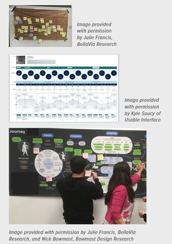 There is no “right” way to design a journey map. They vary dramatically based on their objectives, the audience, and the team culture (see Figure 3). In fact, ugly maps can be quite high impact, and gorgeous maps can be quite low impact!
